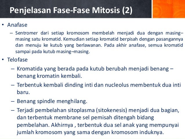Pembelahan secara mitosis akan Pembelahan meiosis disebut juga dengan pembelahan reduksi, karena menghasilkan sel anak.