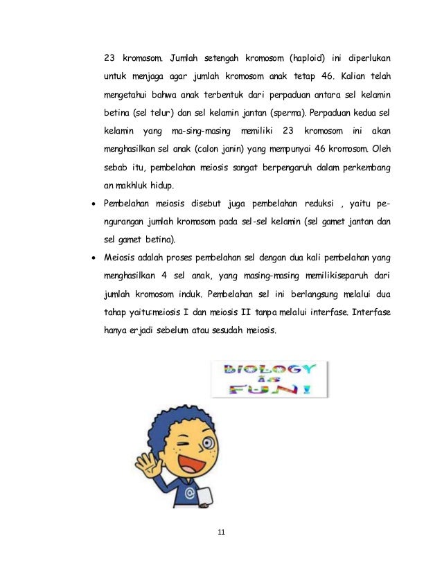 Setiap sel anakan mengandung jumlah Sel induk dan anak memiliki kesamaan jumlah kromosom tetapi sel anak masih bisa membelah lagi.