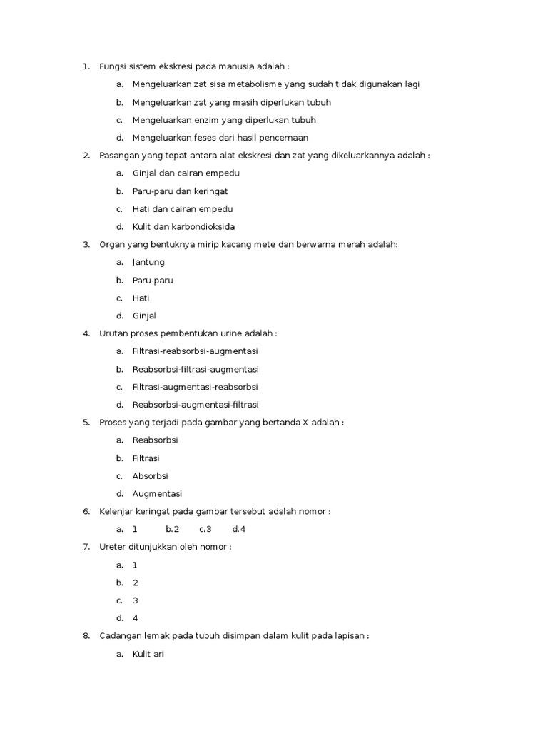 Tugas utama organ-organ tersebut yaitu membuang sisa metabolisme. Sistem ekskresi adalah sistem pembuangan zat-zat sisa pada makhluk hidup, seperti karbon dioksida, urea, dan racun melalui alat ekskresi. Zat ini akan menjadi racun jika tidak dikeluarkan oleh tubuh. Urutan yang benar pada sistem reproduksi wanita adalah Documents Similar To Fungsi Sistem Ekskresi Pada Manusia. Jumlahnya ada dua dan terletak di kanan dan kiri tulang belakang. materi biologi tentang Sistem Ekskresi pada Manusia meliputi Pengertian Ekskresi, Organ-organ Sistem Ekskresi Manusia, dan kelainan pada sistem Fungsi epidermis adalah sebagai sawar pelindung terhadap bakteri, iritasi kimia, alergi dan lain-lain. Sistem ekskresi merupakan proses pengeluaran zat-zat sisa metabolisme yang sudah tidak digunakan lagi oleh tubuh. Fungsi hati pada sistem ekskresi manusia adalah menghasilkan empedu yang merupakan cairan jernih kehijauan, di dalamnya mengandung zat warna empedu (bilirubin), garam. Berikut ini beberapa fungsi hati di dalam sistem ekskresi manusia Sistem Ekskresi adalah sistem pengeluaran zat-zat sisa metabolisme yang tidak berguna bagi tubuh dari dalam tubuh.