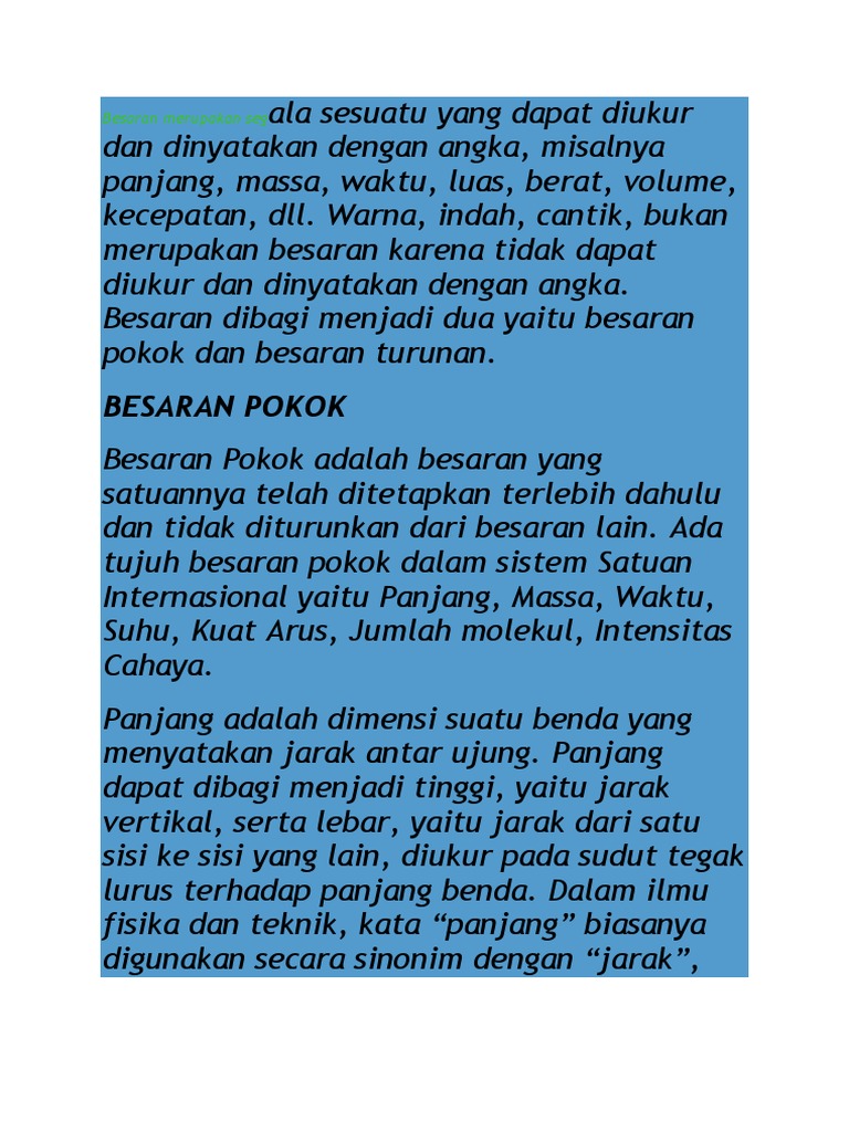 Besaran secara umum diartikan sebagai segala sesuatu yang dapat diukur dan dinyatakan dengan angka. Besaran adalah segala sesuatu yang dapat diukur atau dihitung, dinyatakan dengan angka dan mempunyai satuan. Terakhir, alat ukur yang digunakan untuk mengukur suhu disebut dengan termometer. Apabila bilangan pada awal kalimat tidak dapat dinyatakan dengan satu atau dua kata. Anggaran merupakan salah satu pedoman dalam pelaksanaan suatu pekerjaan, sehingga pekerjaan tersebut dalam dilaksanakan dengan baik sesuai dengan tujuan yang diinginkan bersama. Sedangkan sesuatu yang tidak dapat diukur dan dinyatakan dengan angka dan satuan bukan merupakan besaran fisika.