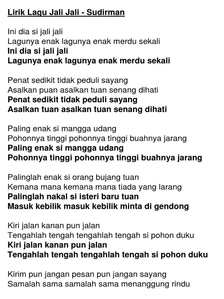 Pohon ini tersebar di berbagai daerah di Indonesia. Lirik Lagu Daerah - Perkembangan zaman yang semakin melaju cepat kadang membuat sebagian orang terlena padanya. Oleh sebab itu, ada baiknya kita kembali atau mulai mengenalkan budaya daerah kita dengan terlebih dahulu mencari tahu apa saja lagu-lagu daerah dari seluruh Jali-jali.