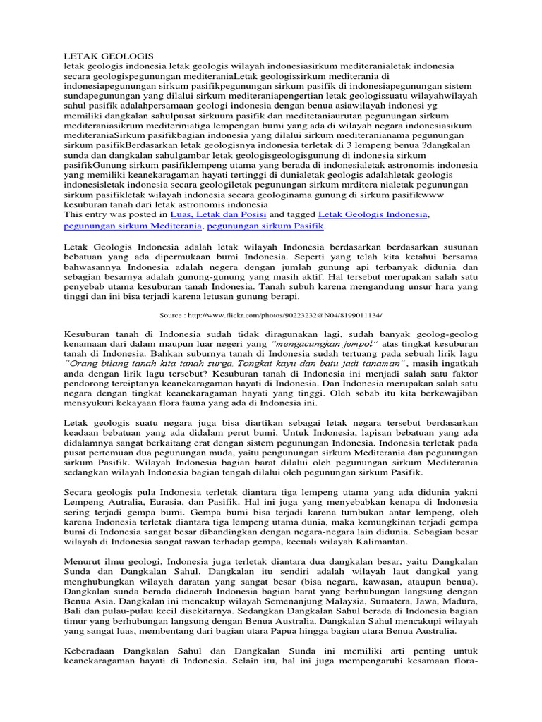 Posisi geologis Indonesia ini menyebabkan Indonesia sering terjadi. a. Indonesia bagian barat dilalui oleh pegunungan sirkum Mediterania. Berada di pertempuan garis pegunungan sirkum Pasifik dan Mediterania, membuat kepualauan Indonesia kaya akan gunung-gunung berapi yang punya keindahan tiada tara. Sirkum Pegunungan Mediterania Sirkum Mediterania memanjang dari wilayah Pegunungan Atlas di Maroko Afrika Utara, ke Pegunungan Alpen di Swiss, Pegunungan Kaukasus di Asia Tengah, hingga sampai dengan Pegunungan Himalaya dan menurun di Teluk Benggala, India. Busur Papua terbentuk akibat tumbukan Lempeng Australia terhadap Lempeng Pasifik. Sering muncul gunung api di tengah-tengah laut terutama di wilayah Indonesia bagian barat yang dilalui oleh rangkaian sirkum Mediterania.