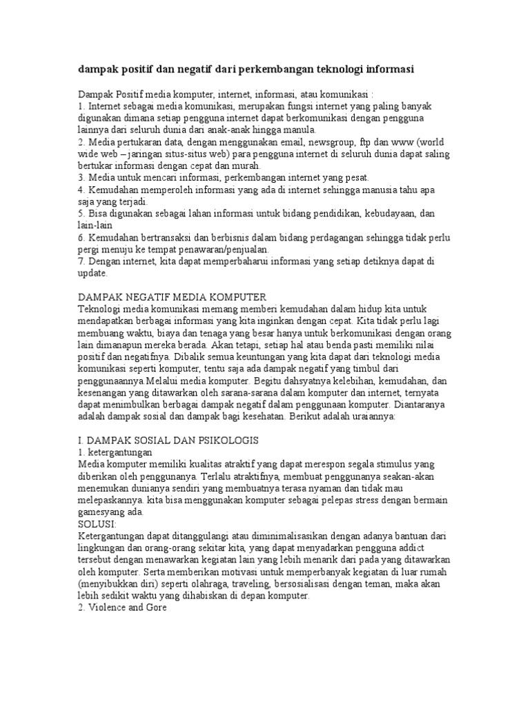 Tidak hanya berdampak positif, teknologi informasi dan komunikasi juga memiliki beberapa dampak negatif yang cukup mengganggu kehidupan sehari hari. Dari keempat dampak positif tanam paksa tersebut, kita dapat menganalisis bahwa selain dampak buruk yang diterima, setidaknya. Adapun dampak positif perubahan sosial sebagai berikut. Perkembangan teknologi di satu tempat dengan mudah segera ditiru di tempat lain. Di bawah ini akan dijelaskan dampak-dampak positif maupun negatif dari penggunaan internet Penerapan Teknologi Informasi dan Komunikasi dalam Pendidikan Teknologi pembelajaran terus mengalami perkembangan seirng perkembangan zaman. Namun, TIK juga memiliki dampak positif dan negatif. Oleh karna itu, tidak perlu terlalu mengikuti perkembangan jaman, kita harus pandai-pandai memilih cara dalam pergaulan di media. Dengan semua smartphone dan kuota internet, Anda bisa mencari.