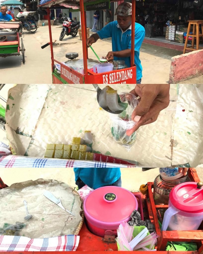 Penjajanya biasa memotong kue selendang mayang berbentuk persegi agak tipis kemudian disajikan di mangkuk.