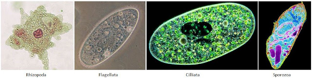 Kelompok protista memiliki tubuh yang tersusun keatas satu sel. Memiliki ukuran Mikroskopis dan Contoh Kingdom Protista. Protozoa merupakan suatu organisme yang menyerupai hewan yang ialah salah satu dari filum dari kingdom protista. Kingdom Protista adalah mikroorganisme eukariota yang bukan hewan, tumbuhan, atau fungus. Sedangkan protista multiseluler merupakan bentuk koloni dari sel-sel protista, belum membentuk suatu jaringan seperti yang ditemukan pada kelompok algae makroskop. Ciri khas protozoa yang lain adalah memiliki vakuola.